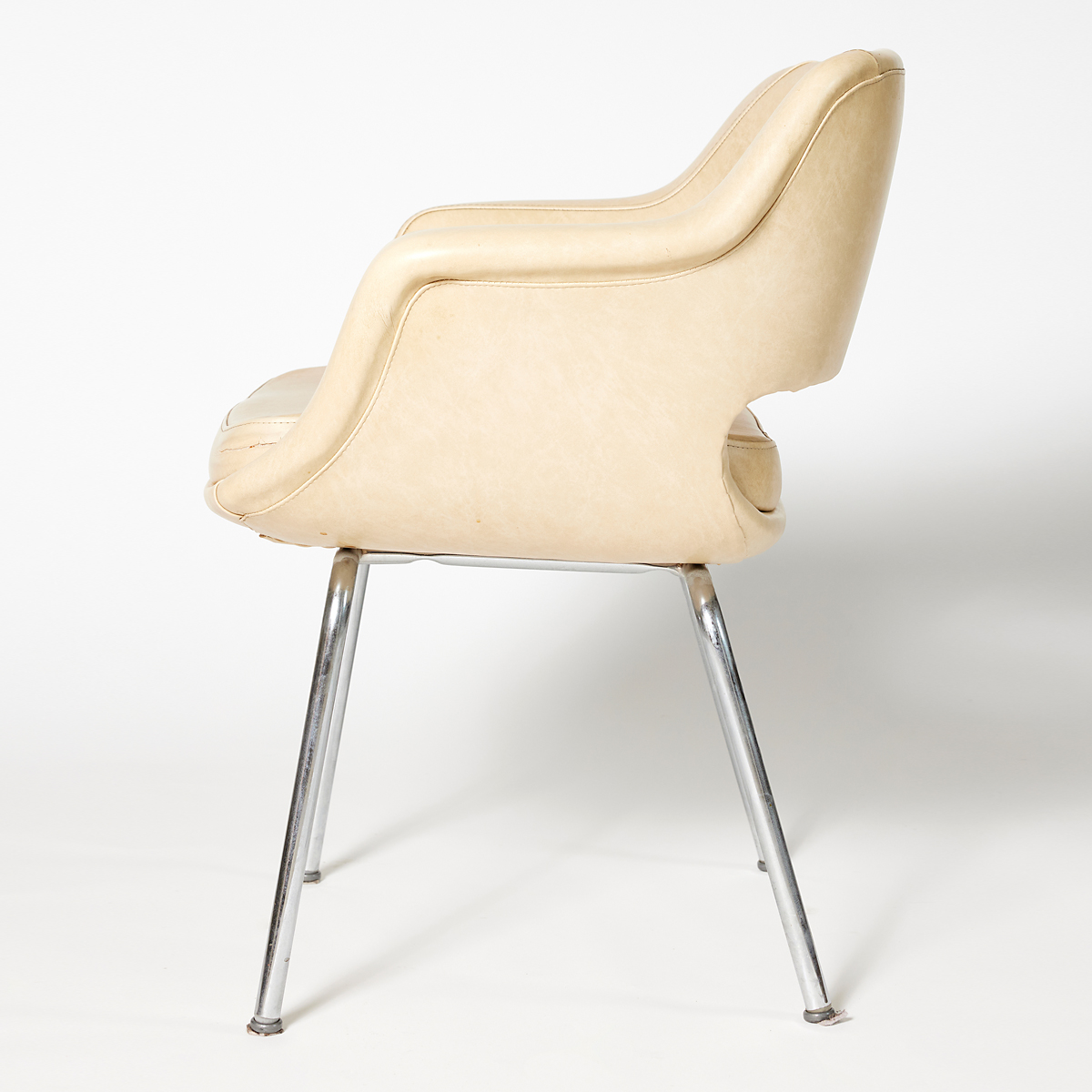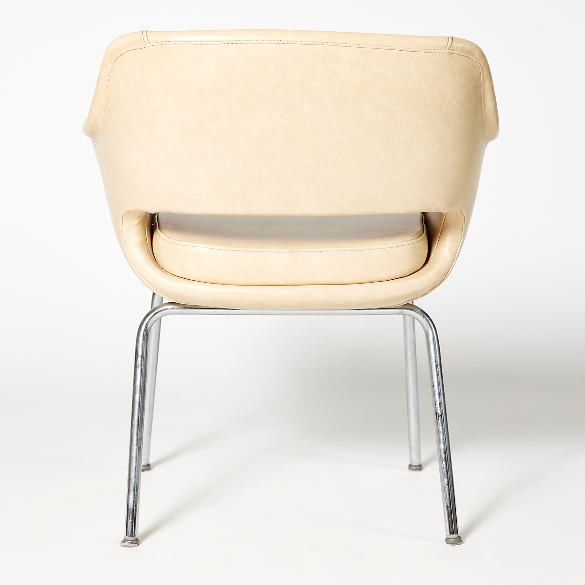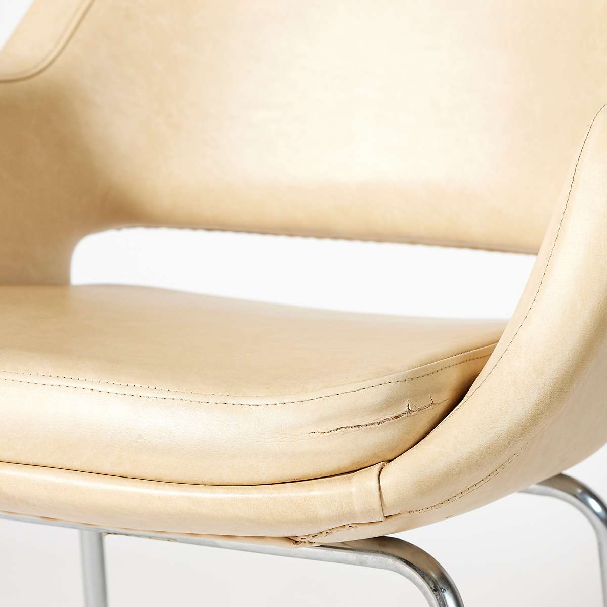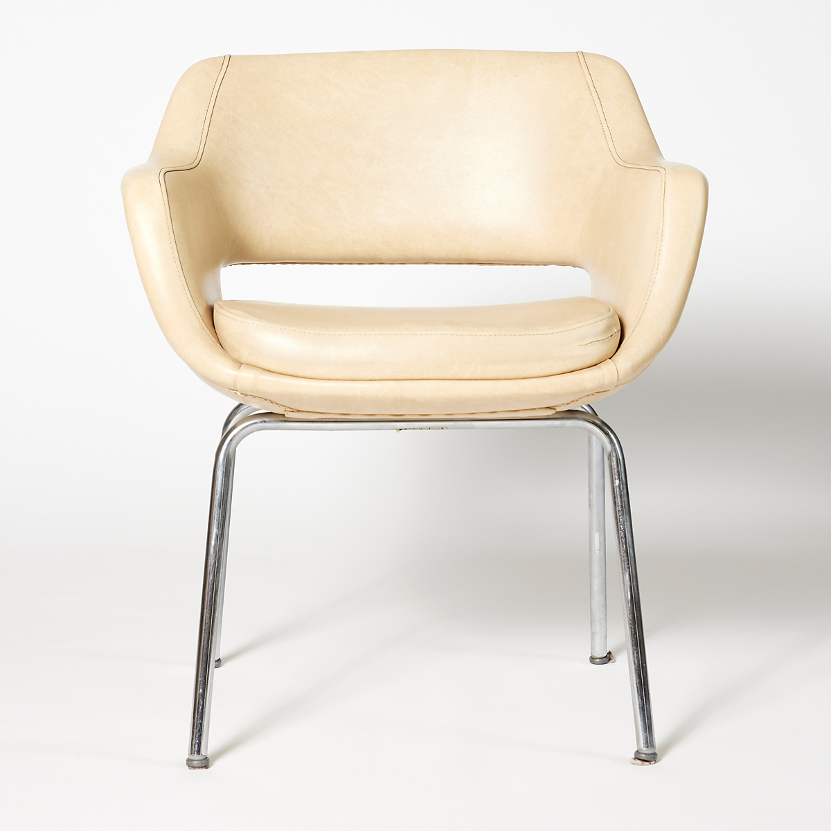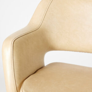 Cadira amb seient i respatller entapissats en to crema, de línies suaus i disseny contemporani. Estructura de potes metàl·liques cromades que aporta lleugeresa i un toc modern. Ideal per a esdeveniments, espais d’estil elegant, rodatges o ambientacions interiors.