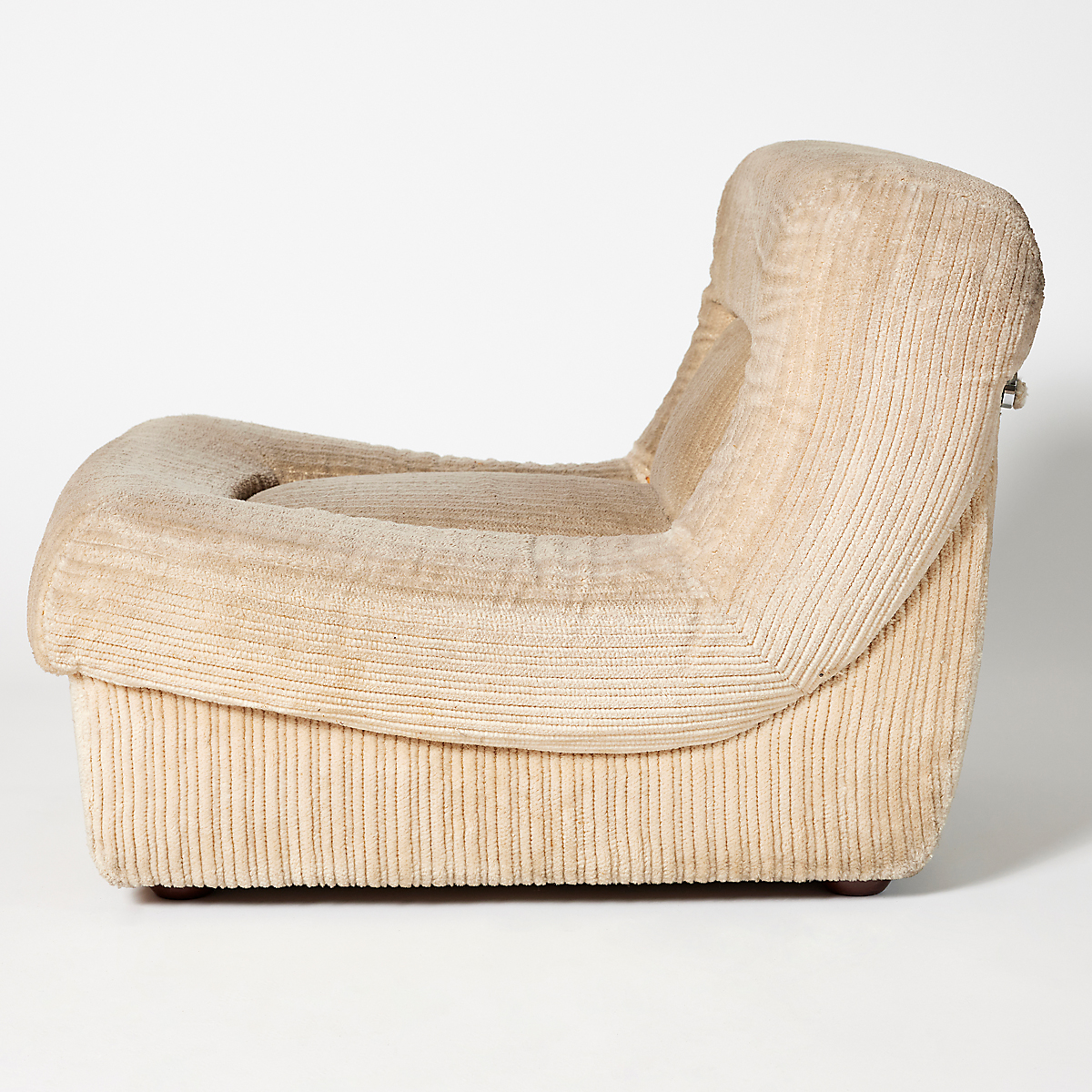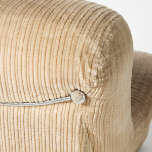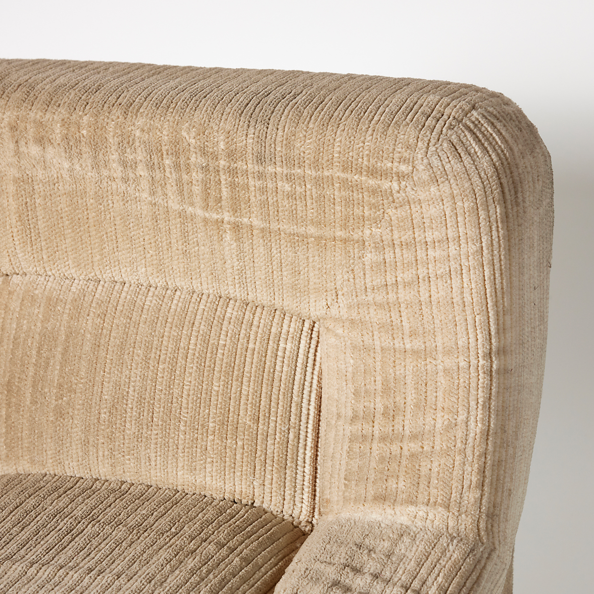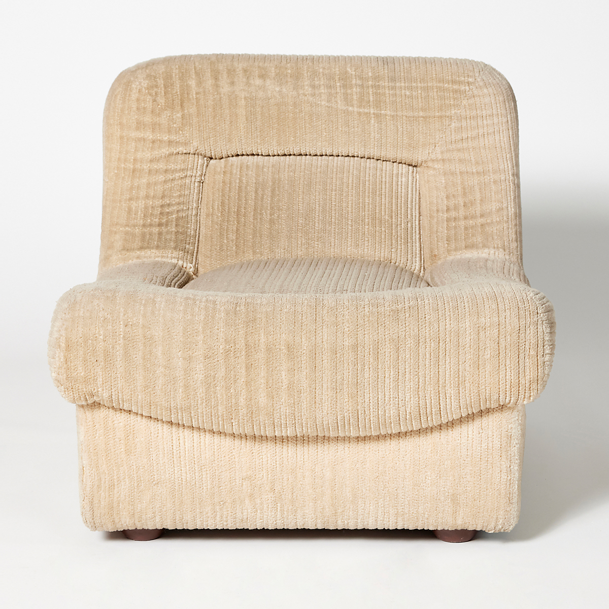 Butaca entapissada modular de vellut canalé en to beix clar, amb formes arrodonides i volumoses que aporten una estètica càlida i acollidora. Disseny contemporani amb aire retro, ideal per crear espais elegants i confortables en esdeveniments, sets fotogràfics, aparadors o escenografies.