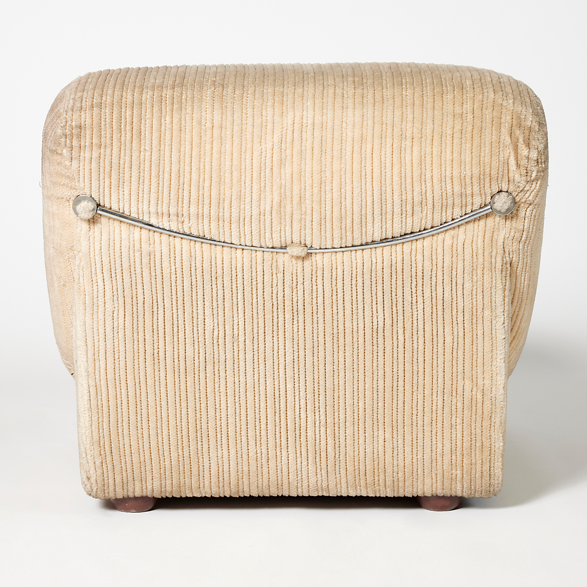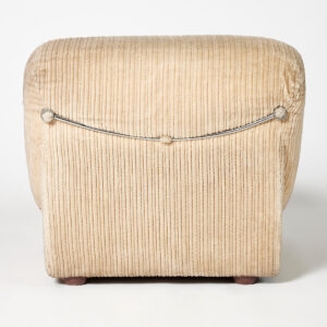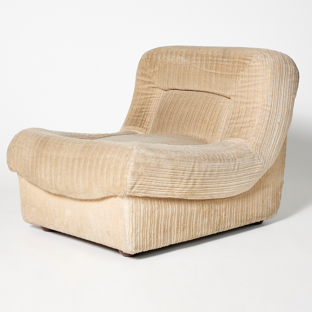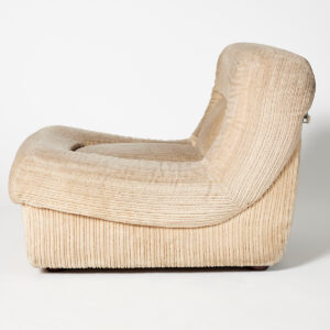Butaca entapissada modular de vellut canalé en to beix clar, amb formes arrodonides i volumoses que aporten una estètica càlida i acollidora. Disseny contemporani amb aire retro, ideal per crear espais elegants i confortables en esdeveniments, sets fotogràfics, aparadors o escenografies.